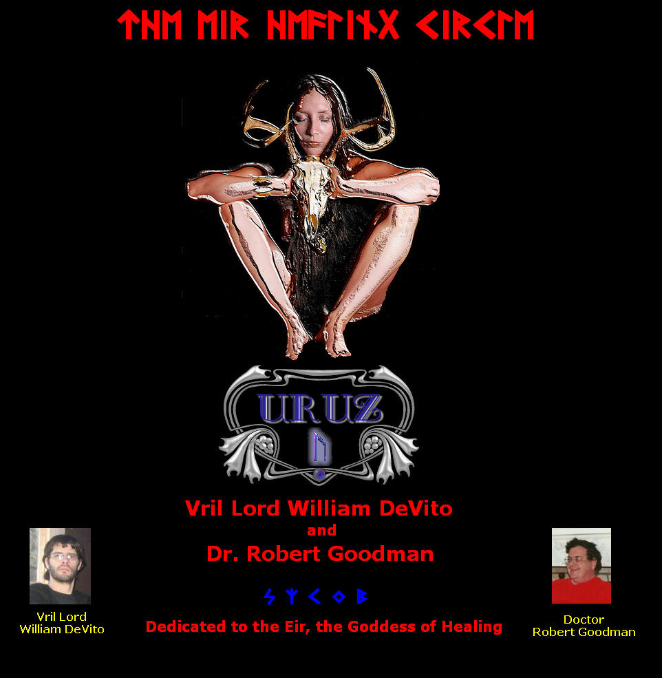 Vril Lord William DeVito has discovered that he was skilled in the healing arts and has taken a personal interest in helping others. he has honed his skills in healing, has demonstrated a mastery as a practitioner of Vrilology and has devoted himself unselfishly to the cause of proving assistance whenever someone has approached the Church with need of healing. Now, one of our newer members, Doctor Robert Goodman, who has a background in biology and medicine, has agreed with work with William in setting up EIR HEALING CIRCLE, dedicated to the Goddess of healing, Eir.