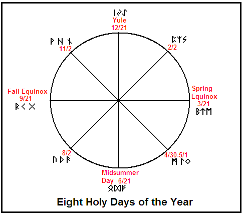 Asatru divides the year into eight days that are considered holy. These are not the only days that should be observed, but they are eight days that divide the year into eight even parts in which powerful natural forces coalesce to perform magick. They should be taken into consideration when you desire to perform a ritual for a specific purpose. But it is also wise to celebrate these days so as to keep yourself align with the natural cycle of nature