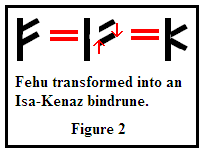 Within this zero-point transforms the power of Fehu by the power of Isa until Fehu’s shape is shifted into a bindrune that is actually a synthesis of the runic energies of Isa (l) and Kenaz (K). We can see in this bindrune the expansive fiery power of Fehu being transformed into a controlled fire by the transformation of its energies that is undertaken when the lower arm of Fehu is reversed into itself until the two arms form a Kenaz Rune (K) joined to an Isa Rune (l). (Figure 2). This runic formula represents the uncontrolled fire runic energy slowly being transformed into a controlled fiery energy to be used for creation. The runic energy of Isa, which is a controlling power, plays of the fiery power of Fehu, and uses it to forge a new reality, much as the forge of the blacksmith is used to transform base metals into valuable objects. This is the power of Kenaz.
