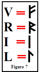 Ymir was the first life-formed, created by the runic principle of fire (Fehu) (F) and ice (Isa) (l). Ymir is the personification of Chaos. Within Ymir is the union of fire, masculine Force, and ice, feminine Form. But this principle is uncontrolled and thus chaotic. Ymir represents Vril energy, which fills the universe, created by the process we have just examined. The very name VRIL written in runic form (FRlL) is a formula for creation of Vril. The first letter, V is represented by the V-sound of the Rune Fehu (F), fire. The second letter R, is represented by the Rune, Raidho, the correct road of transform (evolution) traveled, meaning fire is sent through the proper evolutionary process of transformation. This transformation is caused by the pulling power of the runic symbol of Isa (l) representing the third letter of the word, Vril, I. The forth letter, L, is represented by Laguz (L) which is water, and water is symbolic of Vril, the Life Force, which Laguz represents. (Figure 7).