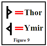 Within the entity known as Ymir, we have the created, controlled fiery power of Kenaz (K) pulled by the icy power of Isa (l). This syntheses gives birth to Ymir, personified by a reversed Thurisaz. (Figure 8). Thurisaz has two meanings: in its forward facing form it represents Thor, the God who keeps the forces of chaos, represented by the Giants, under control, and in the reverse facing form, the Giants themselves.