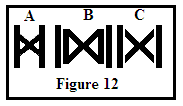 The bindrune created by two facing Thursiaz Runes can be broken down in several ways to understand the esoteric power of the runic energies of this bindrune. If we examine the runic symbols in figure 12, we see symbol A as the two Thurisaz Runes facing each other. Symbol B is the Rune Dagaz (D) squeezed between two Isa Runes (l). We use Isa as a force for and containment, as well as compression. Dagaz is contained with the two Isa Runes. In symbol C, a variation of this process is two Kenaz Runes place between the two Isa Runes. Here we have fire and energy controlled and compressed (Figure 12).
