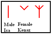 In Elhaz we can see the male penis penetrating the female womb. Here, were have Isa, representing not the female Form, but the male Force as the erect penis, while the fiery Rune of Kenaz represents the female Form. This is the reversal of Fehu and Isa, but then, this reversal is consistent with the androgynous principle of opposites creating perfection, which is within the runic energies of both Gebo and Mannaz.