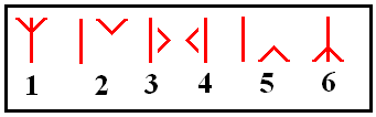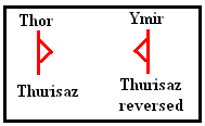 The principle behind Thurisaz and the duality in its nature, one being the chaotic force of Ymir and the other being the order restore force of Thor, is similar to the Perfected state that Mannaz represents, but not exactly. If we take Thurisaz and the reversed Thurisaz and combined them, we have a bindrune similar to Mannaz, but something is askew. It looks like Mannaz, but the Dagaz principle of enlightenment within Mannaz seems to have slipped, thus causing imperfection. While Mannaz represents the Perfected Human, this bindrune, which personifies the chaotic element of Ymir, represents the Imperfected Human, a create dedicated to Chaos and is aligned with the Giants instead of the Gods.