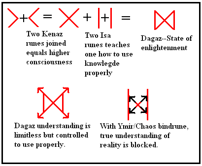 We take a closer look at this Imperected Human Rune, which represents Ymir as Chaos, we can see that it is made up of two Kenaz Runes pointing away from each other. Thus we have creative fire expanding in all direction, which will eventually permit the Perfected Human to achieve universal understanding and a God-like state. When we apply two Isa Runes to help contain or control this knowledge, which represents the levelheadedness needed to know how to properly use such knowledge, for knowledge is power, we have the Rune Dagaz.