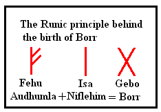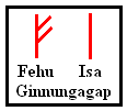 The realm of fire, Musspellheim, can be compared with the masculine power of Force, while the icy realm of Niflheim is the feminine power of Form. These two realms represent the negative and positive polarities of the magnet, thus they represent the mysterious force of gravity. The Rune representing Niflheim is Isa, while the Rune for Musspellheim is Fehu. If we look at the two Runes, we can visualize Isa, in this case representing the feminine principle of Form, as the slit of the female vagina, while the two arms of Fehu represent the erect penis.