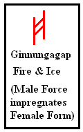 In the process played out in the formation of the universe, the fiery sparks of Musspellheim flew out of the realm of fire in the southern most part of Ginnungagap, and mixed with the icy yeast flowing out of Niflheim in the north, just as the male sperm enters the female fallopian tube to impregnate the ovary. Since Niflehim is the northern polarity and Mussppellheim is the southern polarity, we can see the principle of opposites attracting in the magnetic attraction. The Fiery Force flies north and impregnates the icy Form of the Northern end of Ginnungagap, causing the ice to melt and form a flow of water.