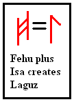 If we create a bindrune from Fehu (Male/Force) impregnating Isa (Female/Form) we discover we have a bindrune that looks remarkably like the rune Hagalaz. Hagalaz is the force of hail, which is ice that is being sent with a sending-force that destroys everything that existed before, then melts into water and refertilizes everything so that new life can grow. This Hagalaz principle is the process behind evolution. The combination of Fehu and Isa, fire melting ice, cause ice to be transformed into water.